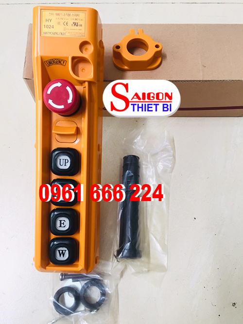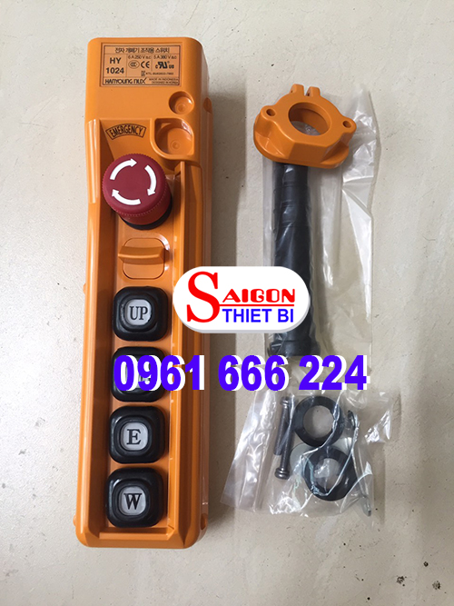 Tay bầm điều khiển HY1024 có thiết kế nhỏ gộn gồm có 4 nút điều khiển và 1 nút dừng khẩn, truyền tín hiệu qua dây cáp dẫn điện đấu trực tiếp từ Palang đến tay bấm.